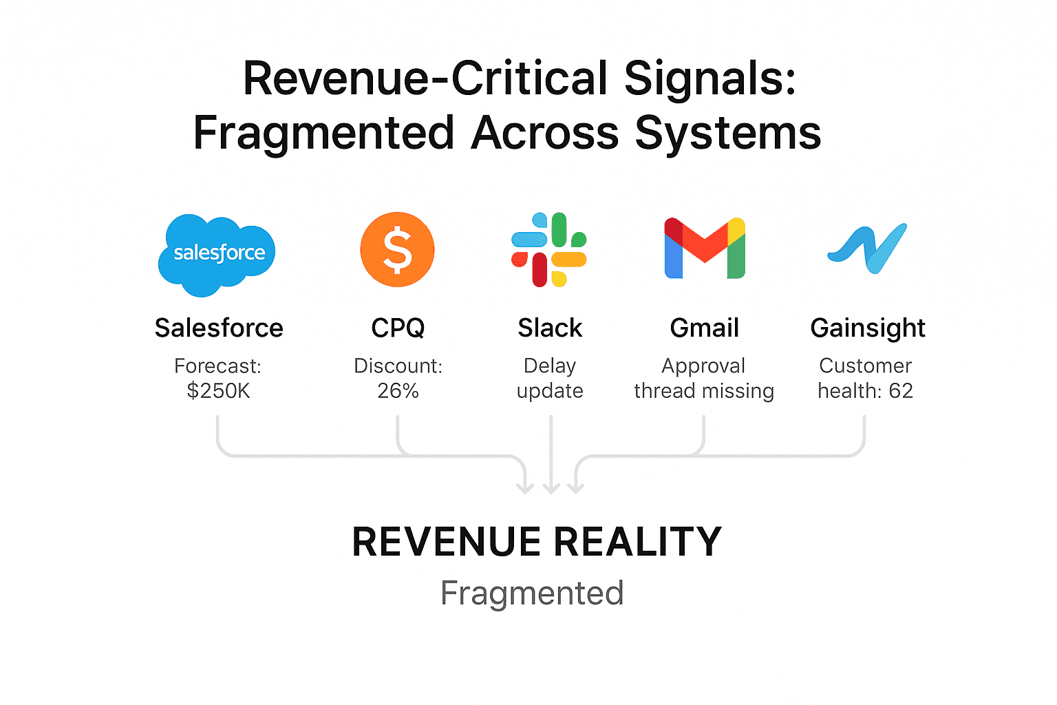 Figure 1: Revenue-critical data lives across Salesforce, CPQ, Gmail, Slack, and Gainsight — but stays siloed. This fragmentation blinds RevOps teams to real risk.
