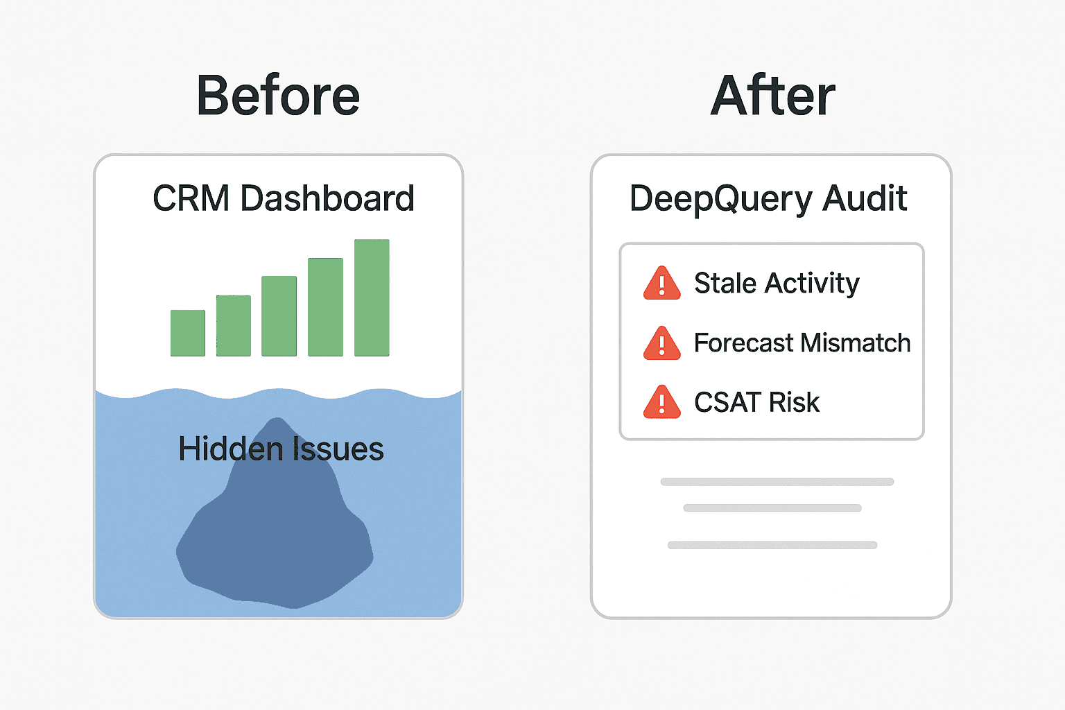 Figure 3: CRM dashboards can give a false sense of security. DeepQuery reveals hidden risks with real-time audit flags like Forecast Mismatch, CSAT Risk, and Stale Activity.