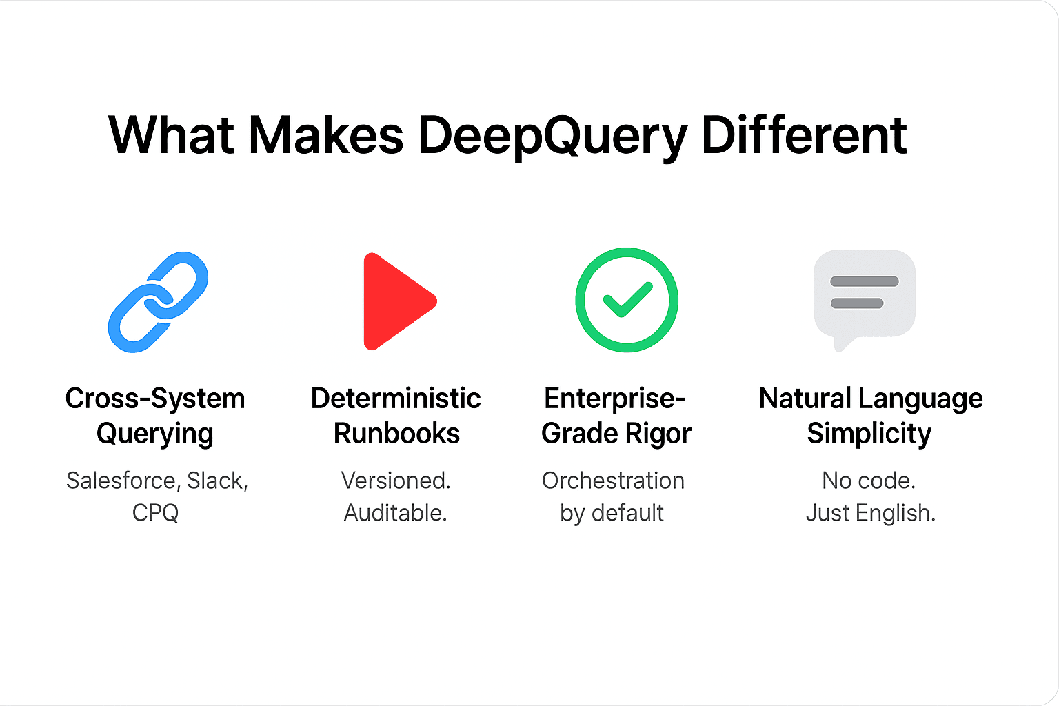 Figure 2: What makes DeepQuery different — deterministic automation across systems, built with auditability and simplicity at its core.